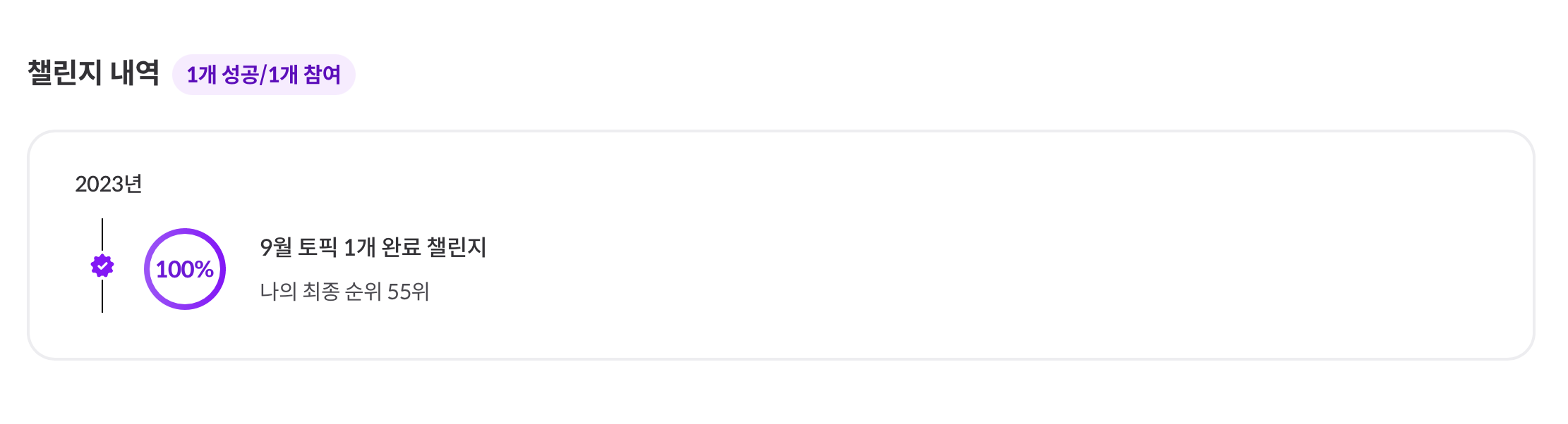 내가 성공한 챌린지는 9월에 토픽 1개 다 듣고, 3일 출석하고, 뭐 강의 20개인가 듣기였나? 이거를 모두 달성하면 저렇게 챌린지가 성공했고 내가 얼마나 빨리 챌린지를 성공했는지 순위도 뜬다!