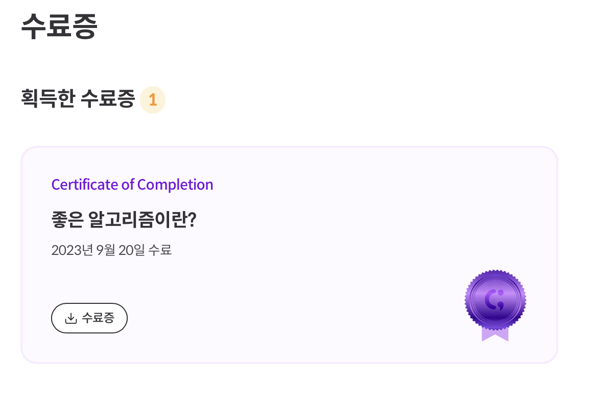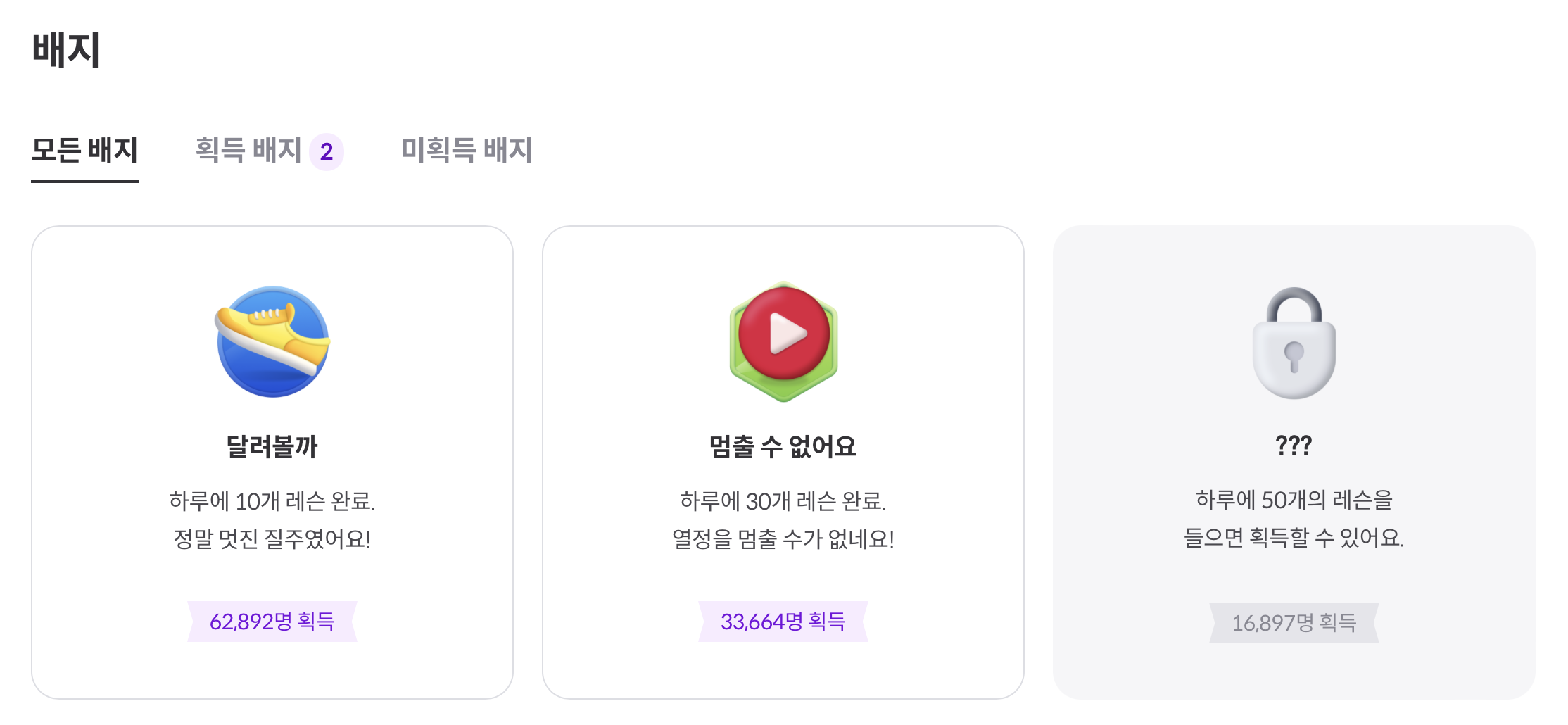 하여튼 코드잇 강의 수강하면 저것처럼 수료증도 나온다! 성취감 뿜뿜 하는 시스템ㅎ 그리고 하루에 강의 진짜 많이 들으면, 이런 식으로 여러 배지를 얻을 수 있는 방법이 있는데, 나는 진짜 하루에 열심히 달렸더니 배지 두 개나 획득했다 ㅋㅋㅋ