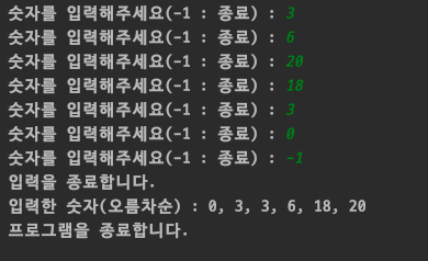 System.out.printf("숫자를 입력해주세요(-1 : 종료) : ");